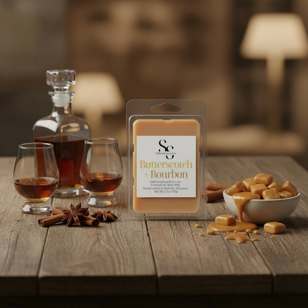 Butterscotch, brown sugar, and warm bourbon swirl with oak and smoky patchouli for a luxurious cozy scent.